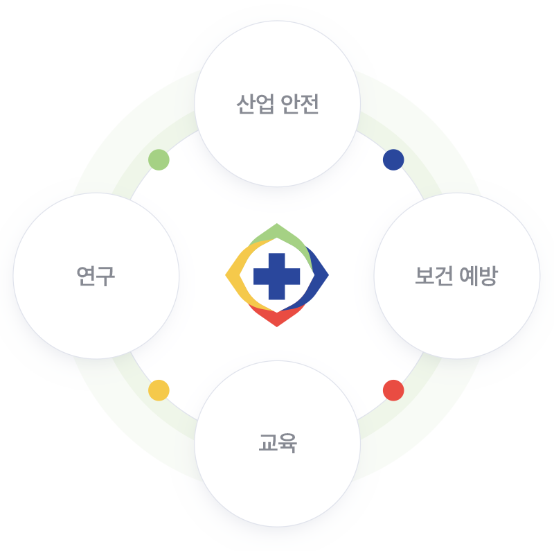 십자가를 둘러싼 4가지 방향과 색상은 산업 안전, 보건 예방, 교육, 연구 등 협회의 다양한 활동 영역을 표현합니다.